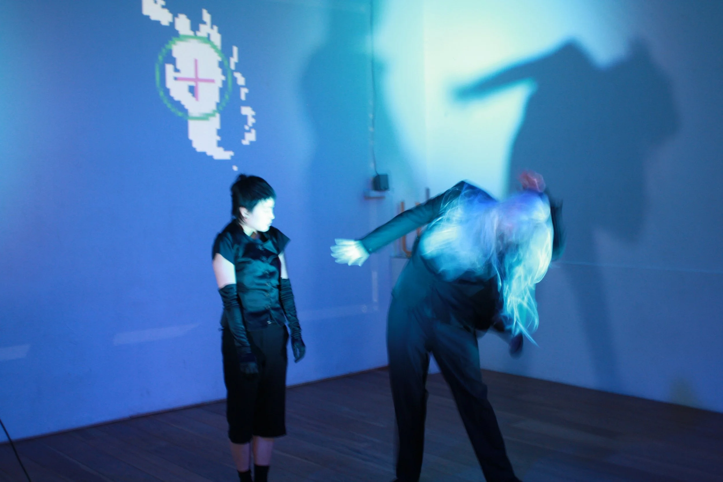 Two bodies, along with the audience, discover how the system works and experiment to see what they can do with it. They then use the system to attempt to transcend the limitations of their bodies, allowing them to access new and unseen aspects of themselves through a partnership with technology.